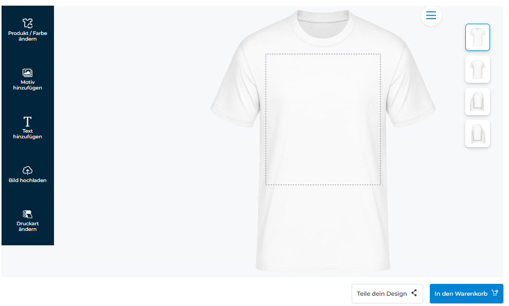 Ein T-Shirt kann in der Regel immer auf vier Seiten bedruckt werden. Klicke zum Beispiel für die Rückseite auf das zweite Kästchen rechts neben dem Produkt, auf das dritte Kästchen für den linken Ärmel usw..